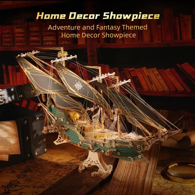 Its layered sails, carved hull, and decorative base create a display piece that reflects craftsmanship and patience. The interlocking wooden system ensures stable construction without adhesive.