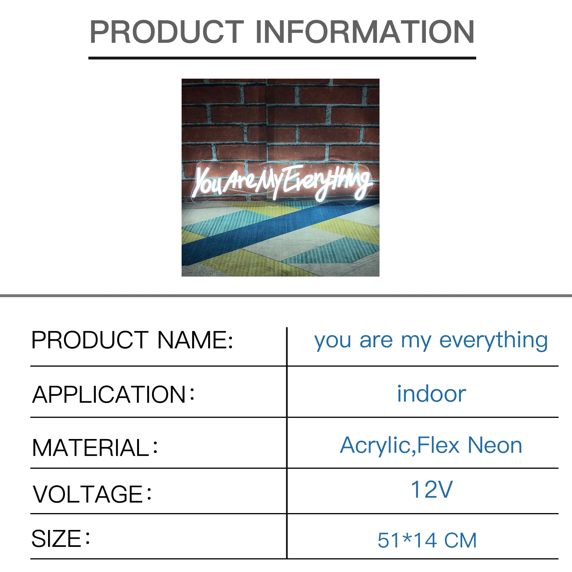 Emitting a soft, white luminescence, the 'You Are My Everything' neon sign brings words of deep affection to light, quite literally. Its flowing script and warm message make it a statement piece, ideal for anniversaries, weddings, or even as a permanent display of amour in a shared home. As it stands out against the darker background, this sign is a modern amourous note, a constant reminder of unspoken bonds and whispered intimacies.