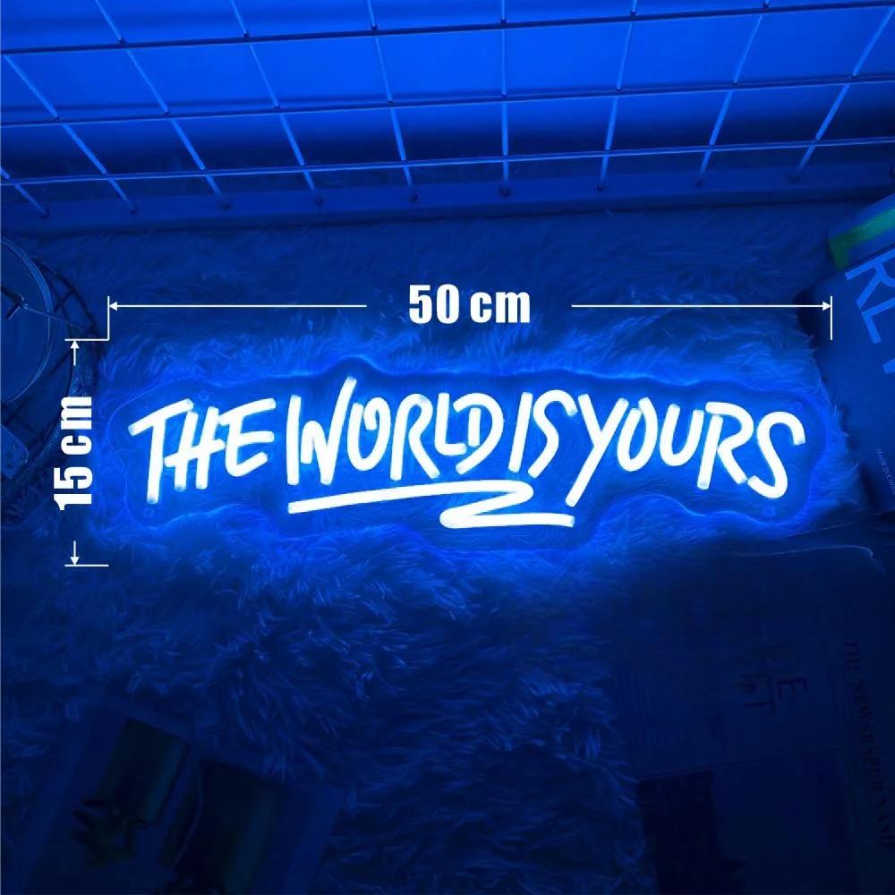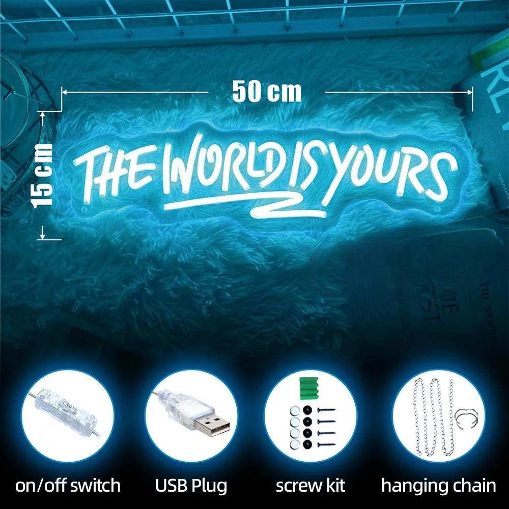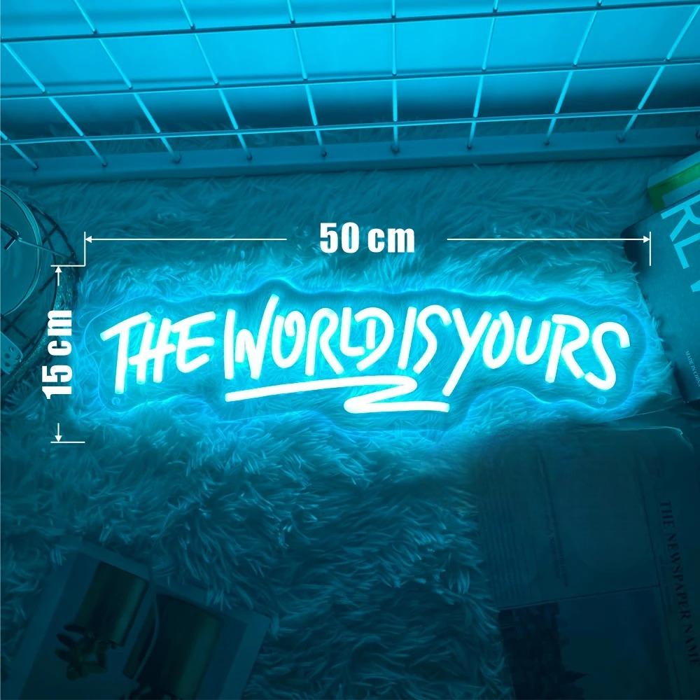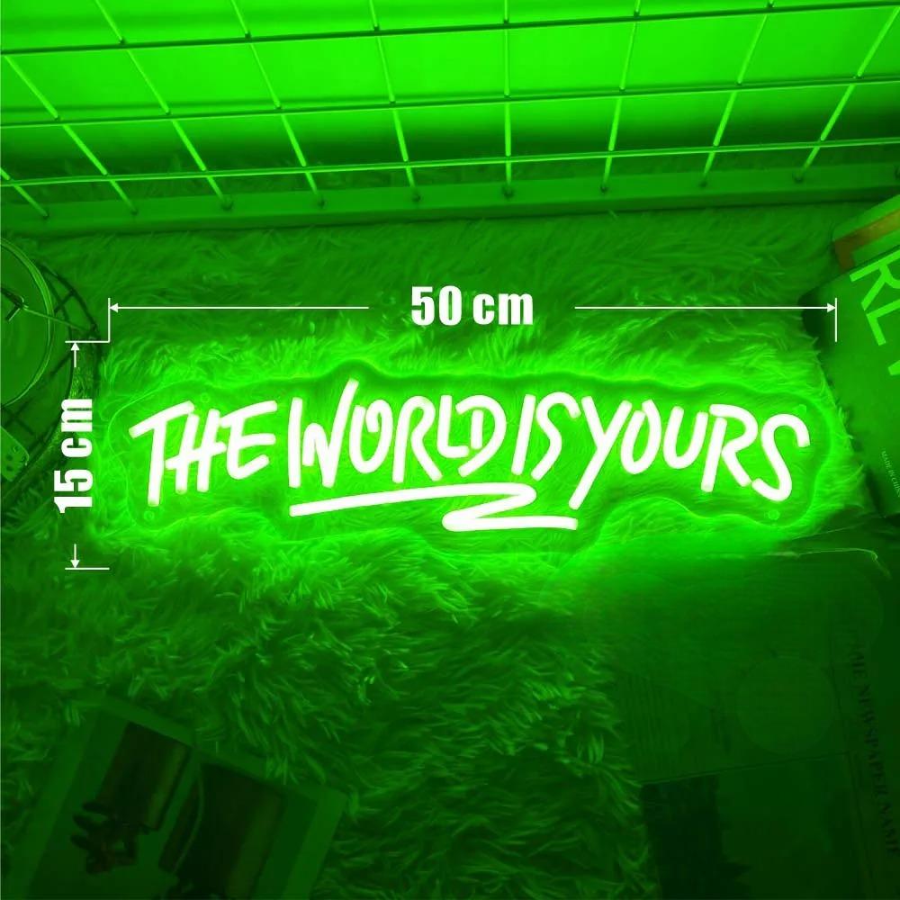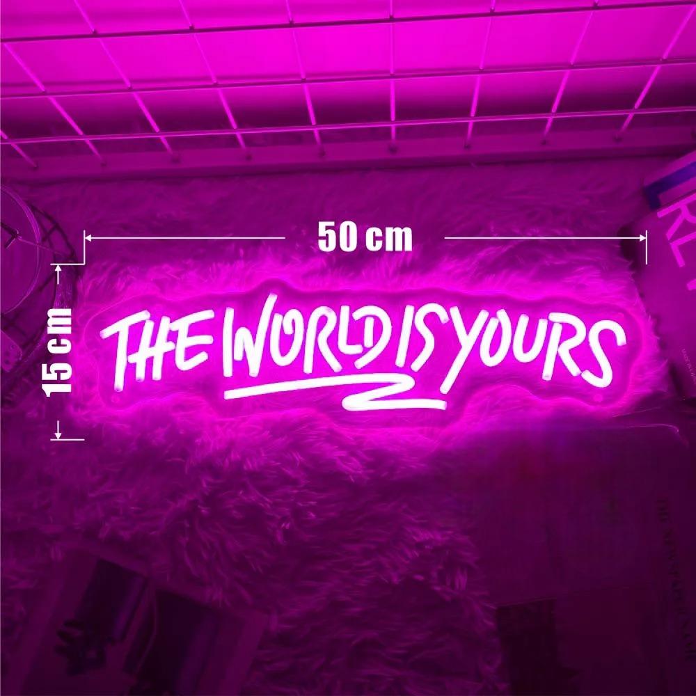 Illuminate your space with inspiration using this 'The World Is Yours' neon LED sign, a brilliant accessory for bedrooms, game rooms, or personal workspaces. This sign serves as a daily empowerment reminder and a source of ambient lighting.