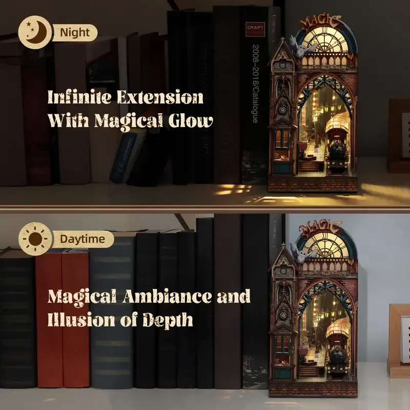 The LED 3D Wooden Book Nook Puzzle Kit With Lighted Miniature Station Scene transforms an ordinary shelf into a detailed miniature world. Designed as a 3D insert, this kit forms a layered station environment that fits neatly between books. It blends craftsmanship, lighting, and architectural styling into one engaging project.